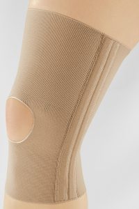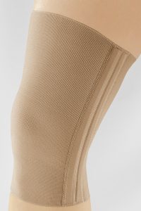 A estável joelheira elástica JuzoFlex Genu 320 com espirais laterais duplas é feita em malha circular resistente e duradoura, sem costura, da classe de compressão 2. Com um ângulo anatómico, adapta-se otimamente à forma do corpo. A malha especial incorporada na fossa poplítea previne os estrangulamentos ao dobrar o joelho. A pedido, também disponível com abertura na rótula.