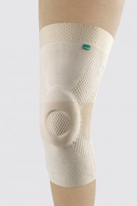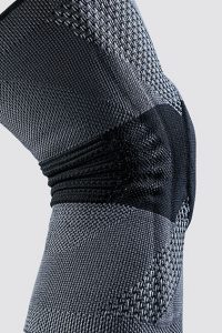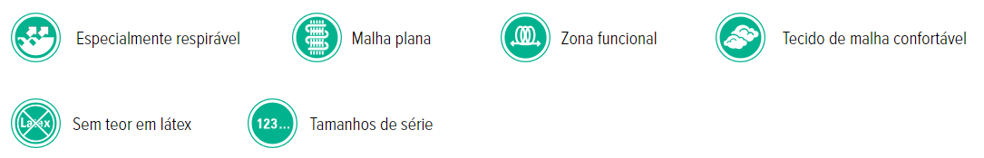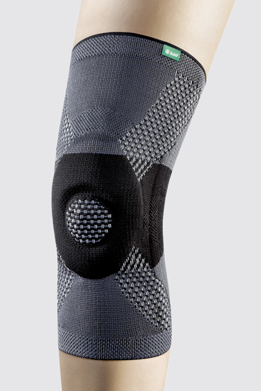 O anel rotuliano, de forma anatómica, orienta a rótula e, durante o movimento, massaja adicionalmente os músculos circundantes. Os rebordos com pressão minimizada envolvem o suporte da joelheira elástica Genu Xtra, evitando que o tecido se comprima e assegurando desse modo um efeito compressivo ótimo.