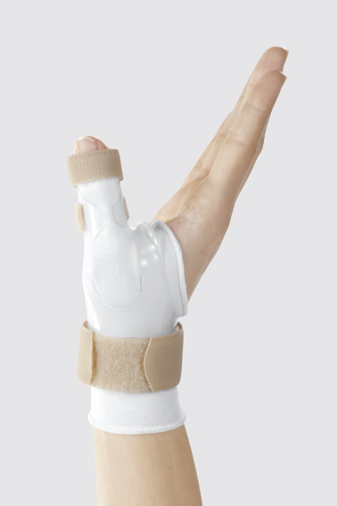 Uma barra amovível na articulação terminal do polegar permite adaptar a ortótese a polegares com perímetros totalmente diferentes. As correias ajustáveis no pulso e o polegar permitem a fixação pretendida da articulação terminal, deixando livre a área acima do tendão extensor.