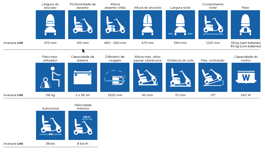 Ascooter de mobilidade Invacare Leo é uma scooter de 4 rodas projetada para todos aqueles que valorizam a sua independência e desejam sair sozinhos. Segurança é uma das características chaves da Leo, mas isto não faz com que a sua elegância passe despercebida. A Leo proporciona aos utilizadores a liberdade e confiança para apreciar as suas saídas diárias essenciais, bem como as saídas em lazer. Com padrões exactos e elevados de engenharia de projeto e de segurança, a InvacareLeo vai sem dúvida seduzir um novo padrão de mercado.